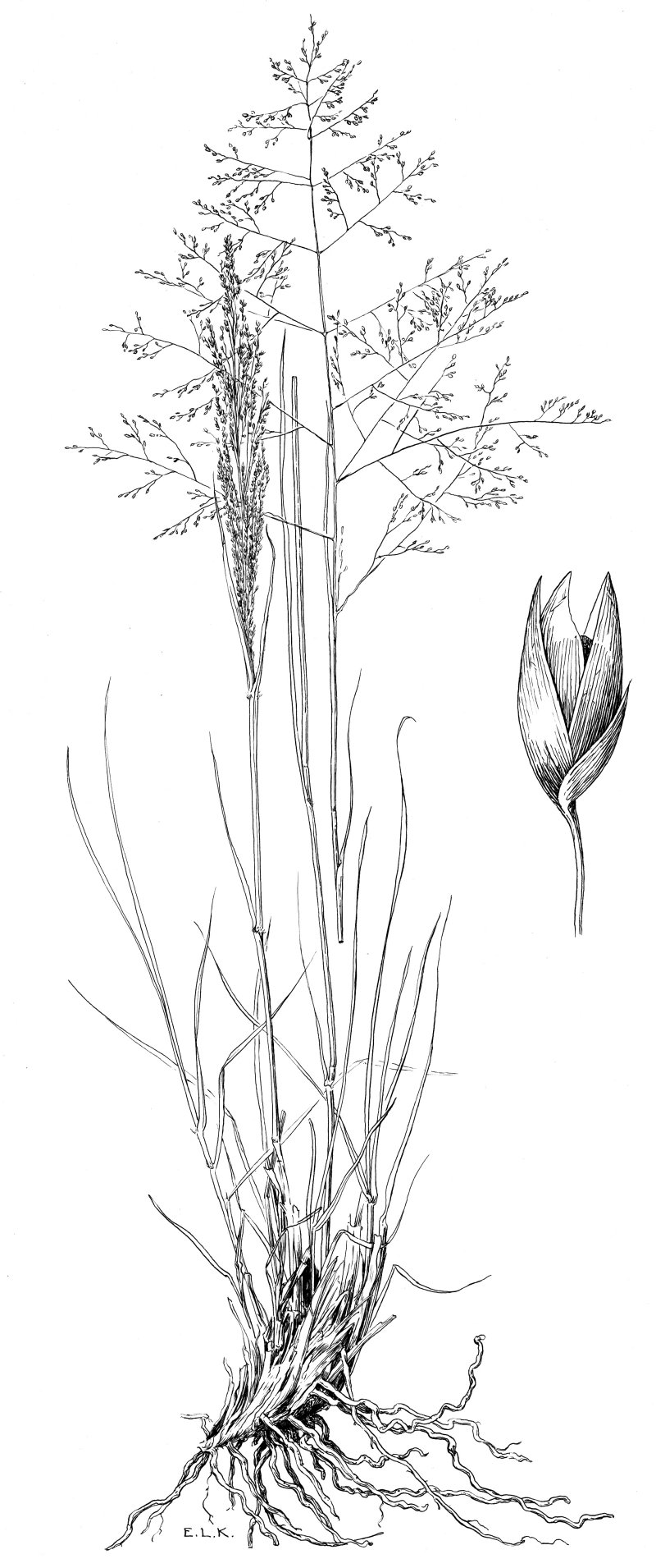 Sporobolus airoides (Torr.). Alkali Sacaton Habit: Perennial, in large tough bunches. Culms: 50-100 cm. tall, erect to spreading, simple. Blades: Elongate, flat, soon becoming involute, 5-35 cm. long, 1-3 mm. wide, sometimes sparingly hairy at the base, elsewhere somewhat rough. Sheaths: Shorter than the internodes, pilose at the throat. Ligule: Very short. Inflorescence: Panicle 10-40 cm. long, nearly half the height of the plant, when mature half to two thirds as wide as long, exserted or partly included, its branches and branchlets at length widely spreading, bearing spikelets aggregated along the outer half to two thirds. Spikelets: 1.5-2.5 mm. long, 1-flowered, awnless, on short pedicels, the lateral about as long as the spikelet rachilla disarticulating above the glumes. Glumes: Acute, glabrous, nerveless, the first about half as long as the second, commonly falling towards maturity, the second about as long as the lemma. Lemmas: Broadly oval, 1-nerved, about as long as the second glume. Palea: 2-nerved, about equaling the lemma, splitting between the strong nerves as the grain ripens. Fruit: Grain free from the lemma and readily dropping off. Habitat: Dry plains and river valleys, especially in alkaline soil. August-September. Kansas Range: Southwest and Shawnee county. Use: A good forage or grazing grass in lowland and in alkali regions.